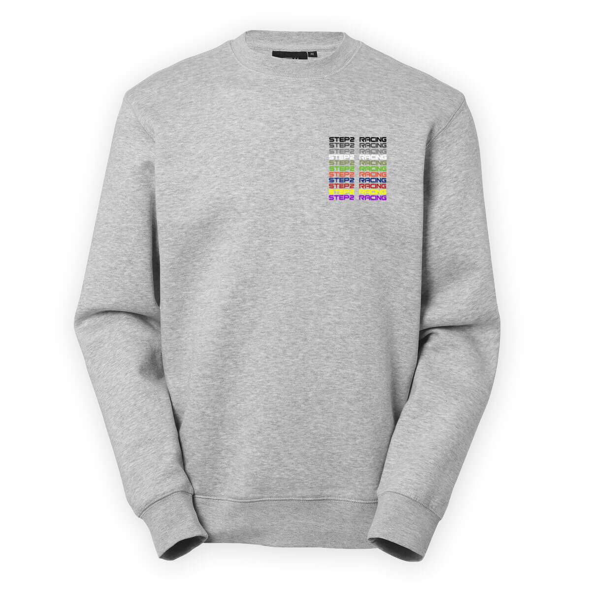 Step2Racingin perinteinen pyöreäkauluksinen collegepaita flatlock-saumoilla ja harjatulla sisäpinnalla. Edessä musta Step2 Racing-tunnus ja takana moniväripainatus.