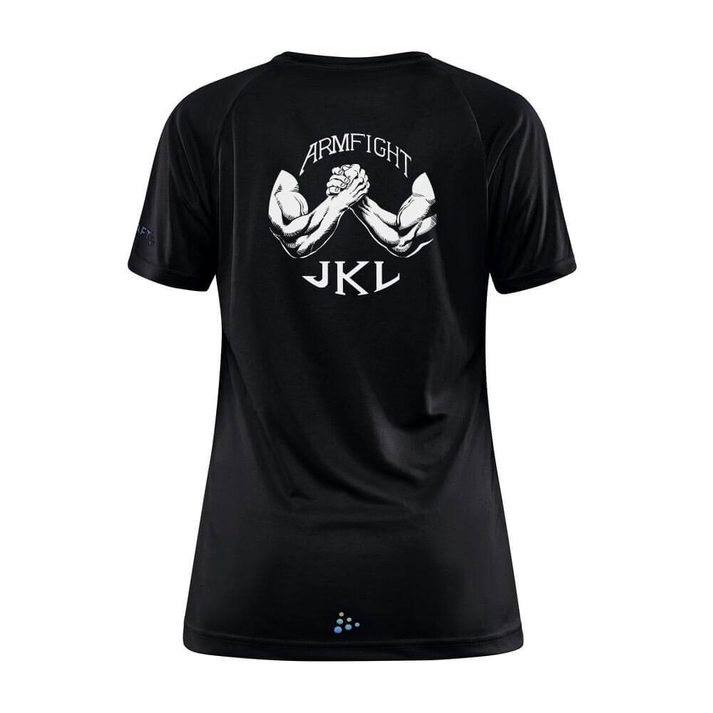 Arm Fight JKL:n tyylikäs tekninen t-paita naisten mitoituksella. Paita on valmistettu kierrätetystä, pehmeästä ja teknisestä polyesteristä. Painatus takana. Voit nyt lisätä myös haluamasi nimen paidan takaosaan.