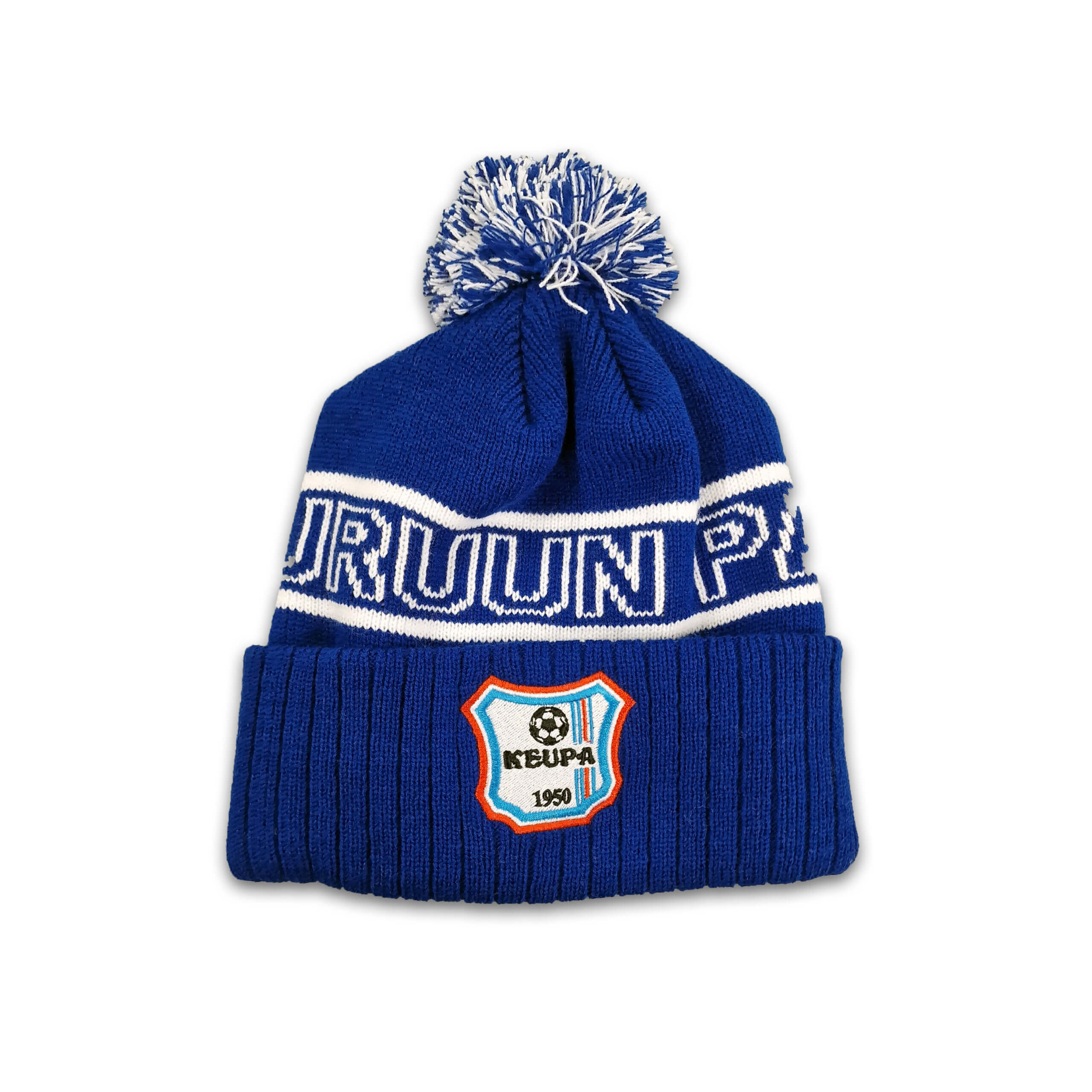 Kudottu lämmin tupsupipo Keuruun Pallo -tekstillä ja KeuPa-logolla.